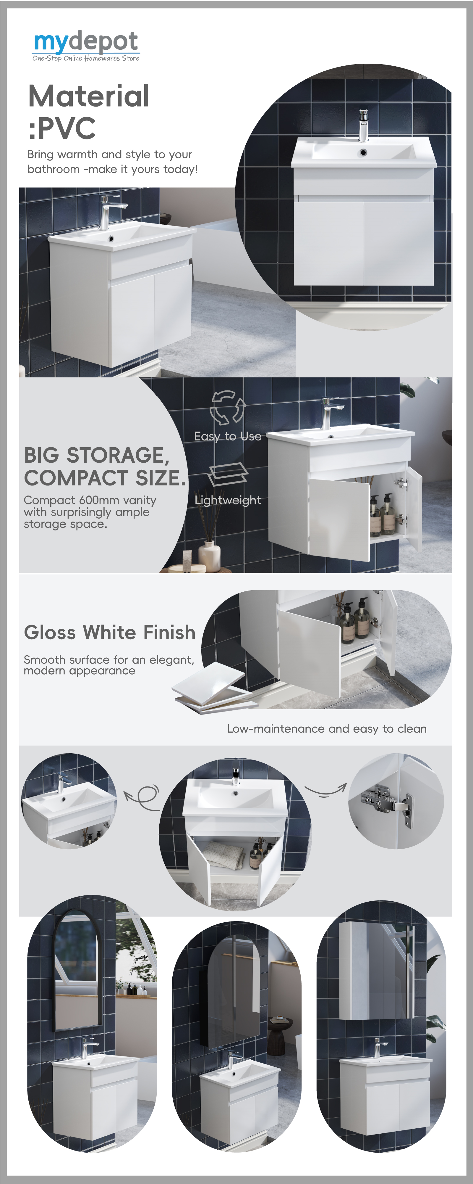 600MM Narrow Gloss White PVC Bathroom Vanity 2 Doors Wall Hung Cabinet Only