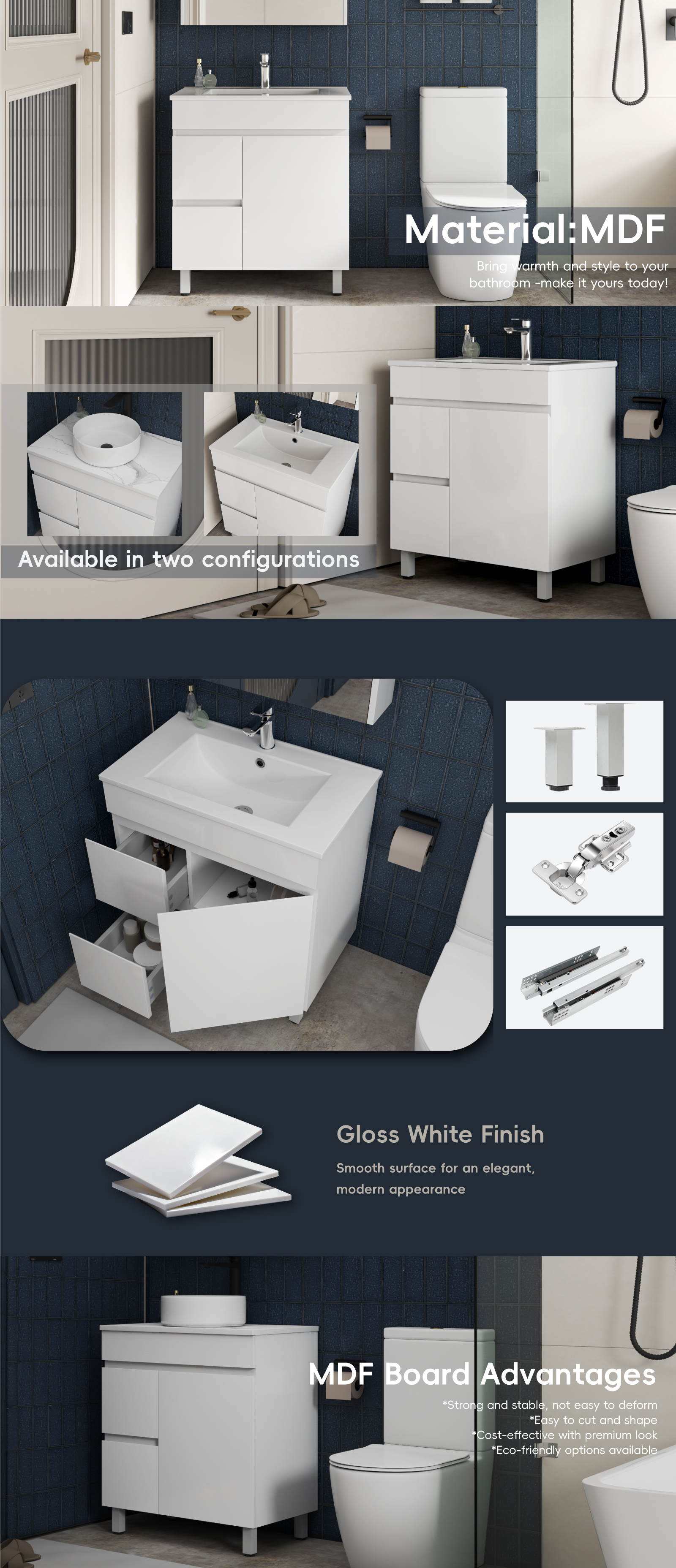 750MM Gloss White MDF Bathroom Vanity Left Drawers Free standing Cabinet Only
